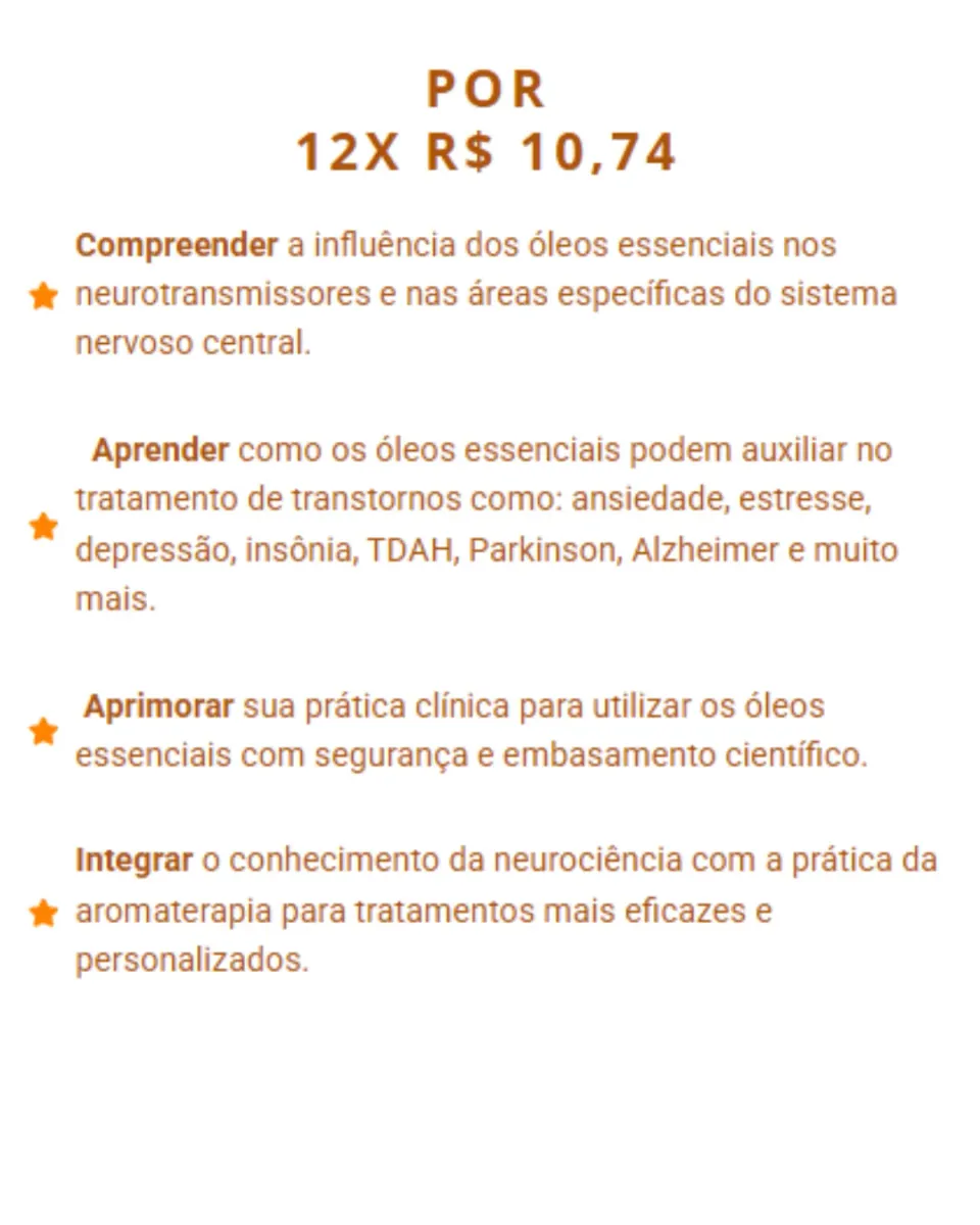 No dia 12 de abril, na Imersão, eu vou te mostrar como a união entre Neurociência e Aromaterapia Clínica pode potencializar tratamentos, oferecendo embasamento científico sólido e resultados farmacológicos eficazes no tratamento de transtornos neurológicos dos seus pacientes.