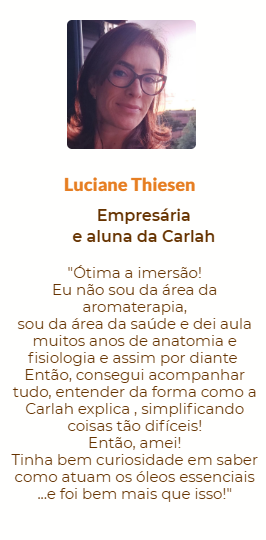 Sou Carla Campos, Aromatóloga e especialista em Aromaterapia Clínica aplicada à Neurociência. Minha jornada na aromaterapia começou por necessidade: enfrentei uma doença autoimune grave e, através do uso estratégico de óleos essenciais e vitaminas, vivi a remissão da doença, o que me despertou maior interesse por aprofundamento nas bases científicas e farmacológicas dos óleos.